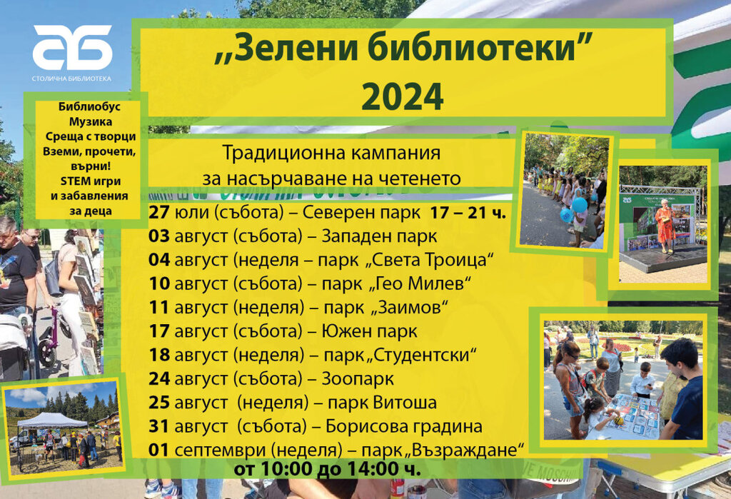 Десетото юбилейно издание на образователната кампания "Зелени библиотеки", организирано от Столичната библиотека, има за цел да насърчи четенето от ранна детска възраст, както и да привлече на нови читателски публики.
