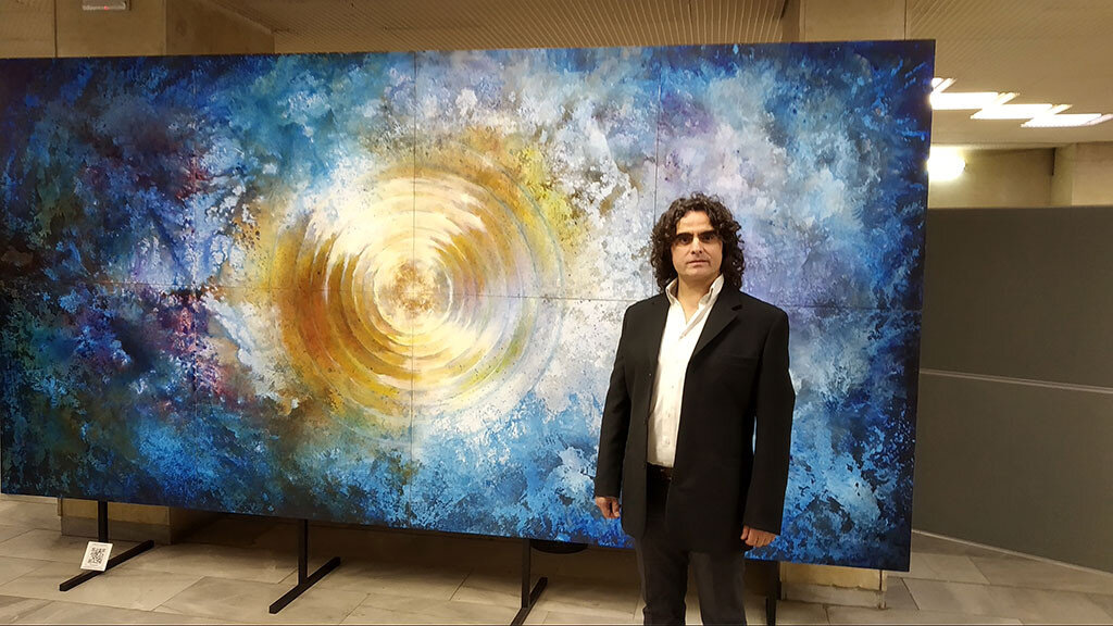Художникът Дончо Дончев пред картината си „Електромагнитно взаимодействие“.