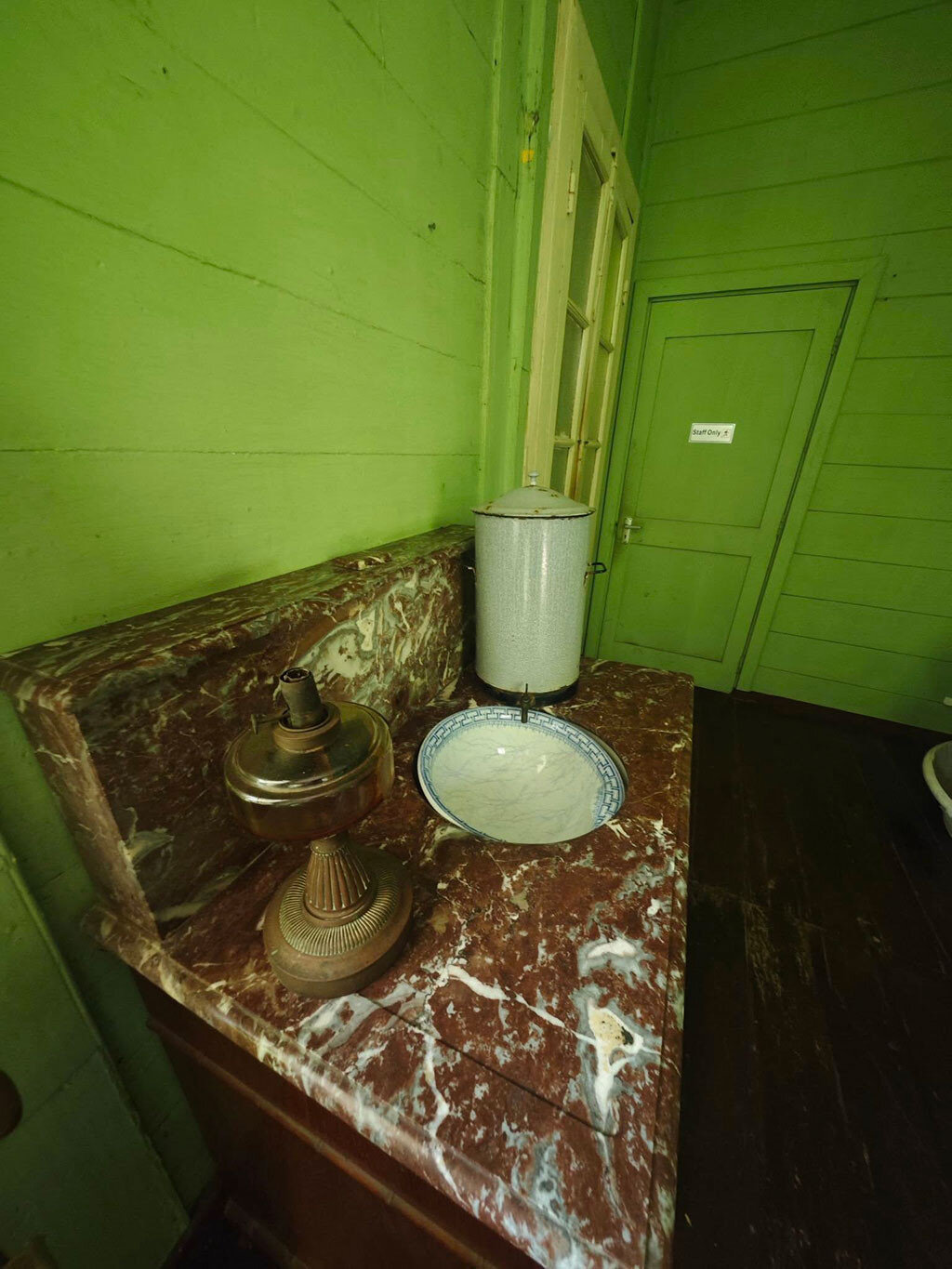 В банята ахкането ми продължава. Ваната е издялана от цял къс мрамор. Хитроумно чугунено съоръжение, подобно на полегнал леген е подпомагало къпането на многобройна челяд под душа, който също е като викторианско произведение на изкуството, с което преди 150 години разполагали малцина. Традиционните шкафове за нощни гърнета приковават погледа.