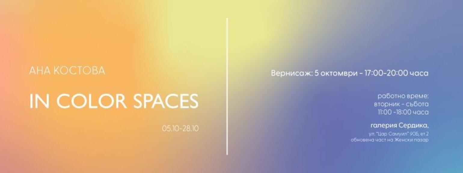 Картини и колажи ще превземат въображението на посетителите в изложбата "In Color Spaces" на младата българска художничка Ана Костова. Тази интересна и разнообразна експозиция представя не само живопис, но и триизмерни обекти, които пресъздават абстрактни форми в пространството. Галерия "Сердика" ще бъде домакин на изложбата от 5-и до 28-и октомври.