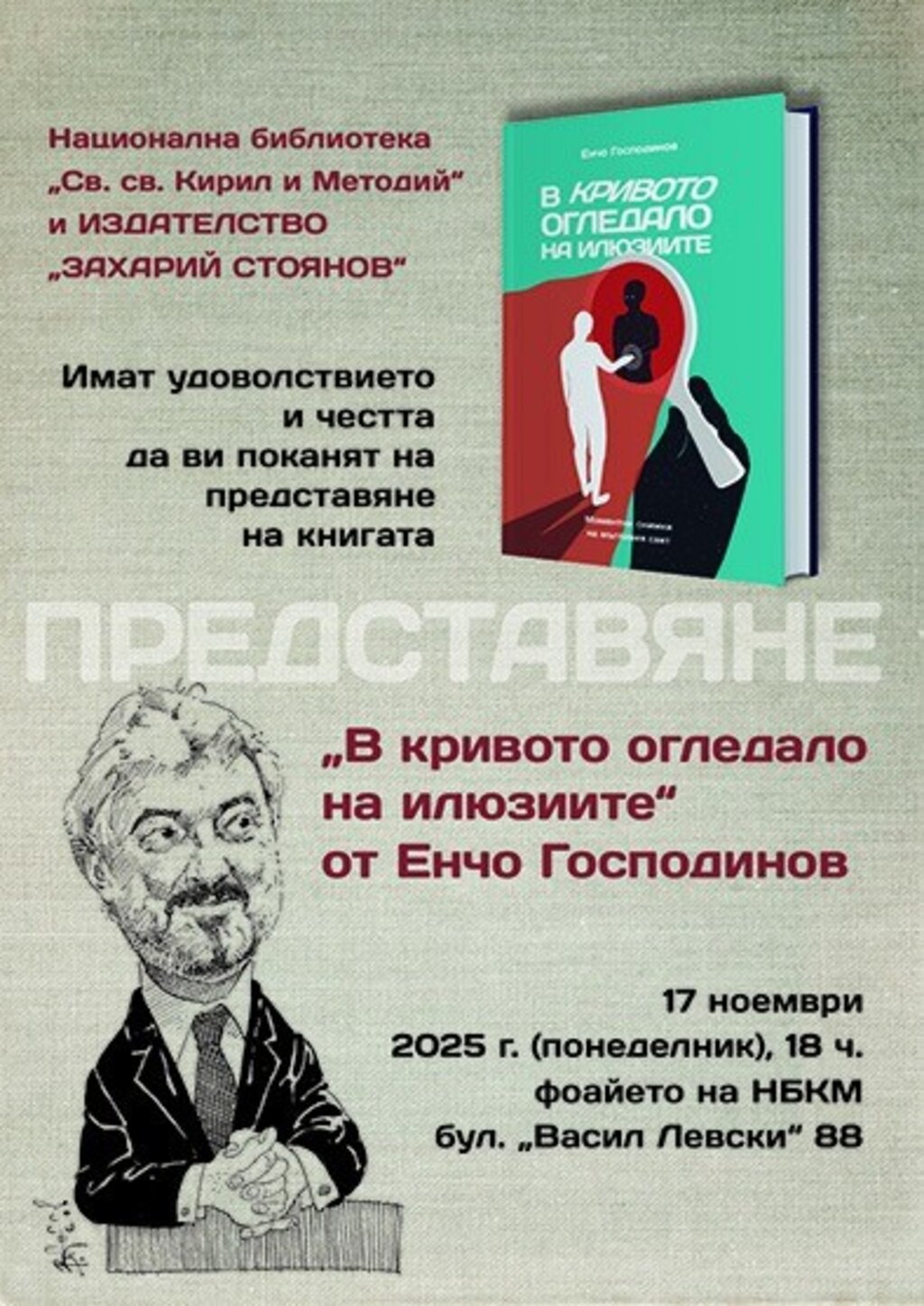 Националната библиотека "Св. св. Кирил и Методий" и издателство "Захари Стоянов" представят новата книга на Енчо Господинов – "В кривото огледало на илюзиите" днес от 18 часа във фоайето на библиотеката.