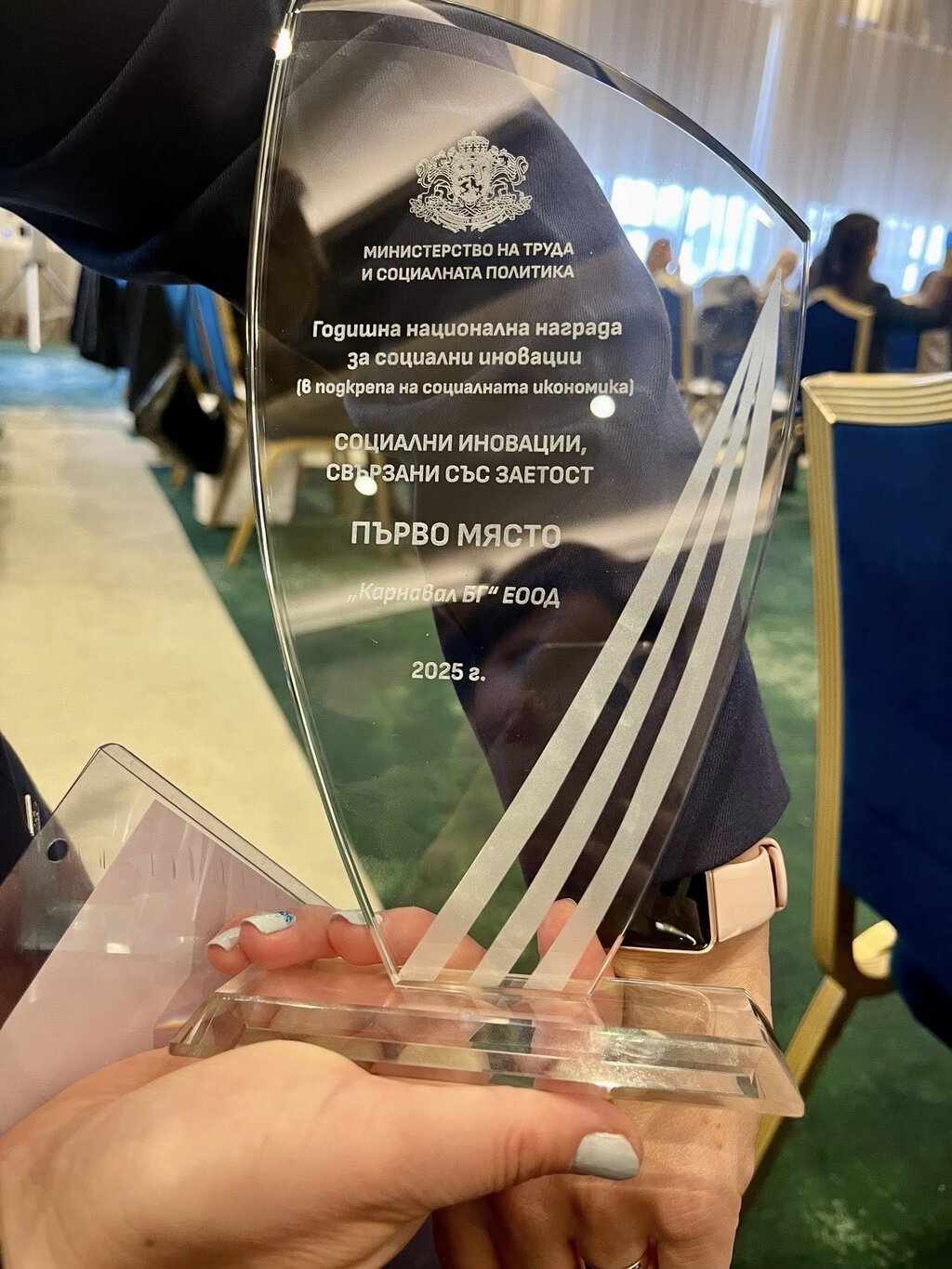 Победител в категория "Социални иновации, свързани със заетост" стана социалното предприятие "Карнавал БГ", което съчетава изработката на автентични български носии с осигуряване на заетост и обучение за хора от уязвимите групи. Собственик на предприятието е Петър Господинов от Варна.