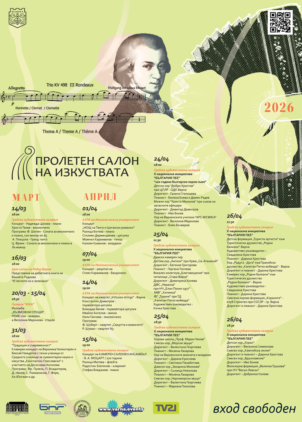 В Градската художествена галерия "Борис Георгиев" във Варна от 19 ч. ще се състои концерт на Камерен салонен ансамбъл, посветен на 270 години от рождението на В. А. Моцарт. Ансамбълът е в състав Ралица Митева – флейта, Радостин Златинов – кларинет, и Стефан Бояджиев – пиано.