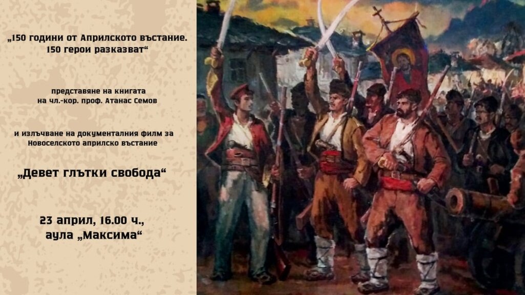 Книгата "150 години от Априлското въстание: 150 герои разказват" от проф. Атанас Семов ще бъде рпедставена на 23 април от 16 ч. в Аула "Максима" на УНСС.