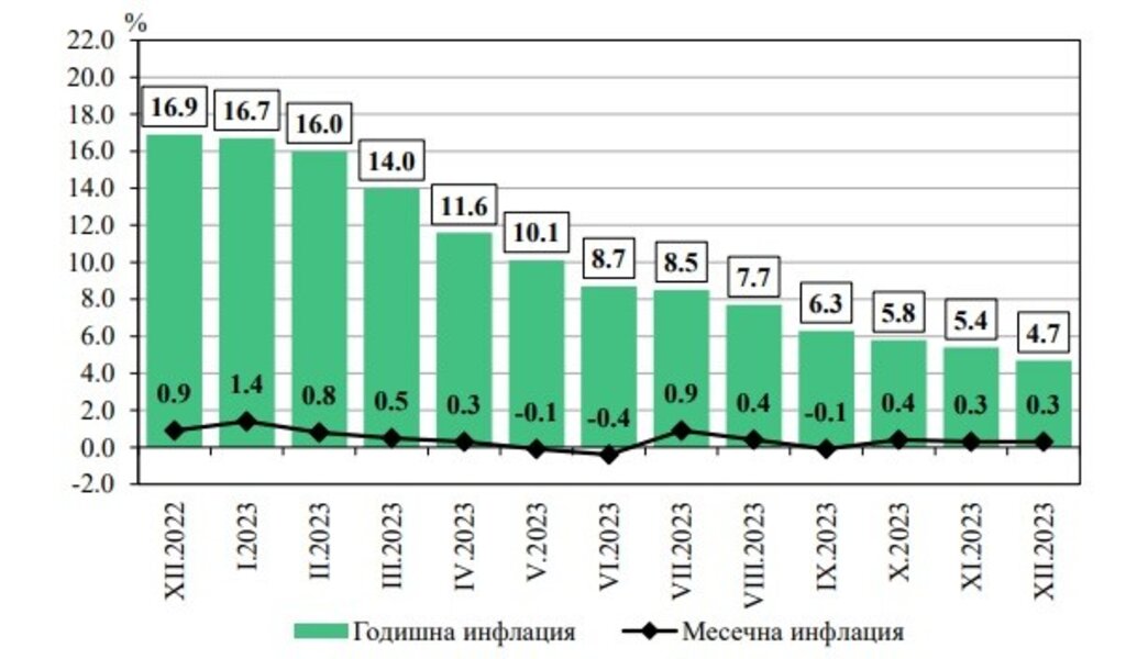 Средногодишната инфлация за периода януари - декември 2023 г. достигна 9,5 на сто.