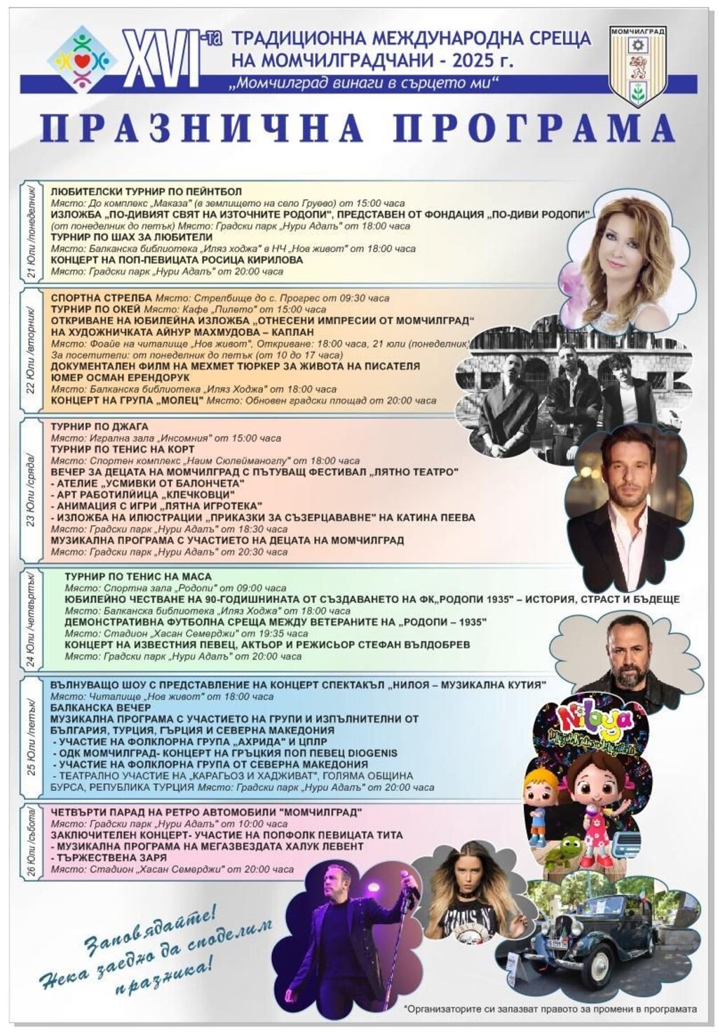 „Дни на момчилградчани“ не са просто фестивал – те са мост между поколения и култури, празник на принадлежност, носталгия и обич. Програмата за 2025 година е по-богата от всякога и превръща Момчилград в сцена на приятелството, музиката и споделените спомени.