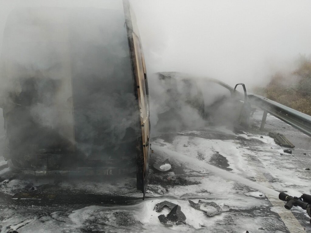В момента екипи на Пожарната гасят пламъците, като има данни за една жертва, останалите пътуващи нямат сериозни травми.