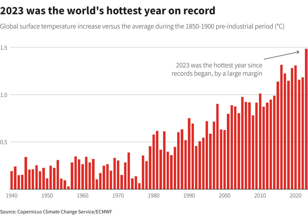През 2023 г. температурата на земята е била средно с 1,48 градуса по Целзий по-висока в сравнение с прединдустриалния период 1850-1900 г., когато хората са започнали да изгарят изкопаеми горива в индустриален мащаб, изпомпвайки въглероден диоксид в атмосферата.