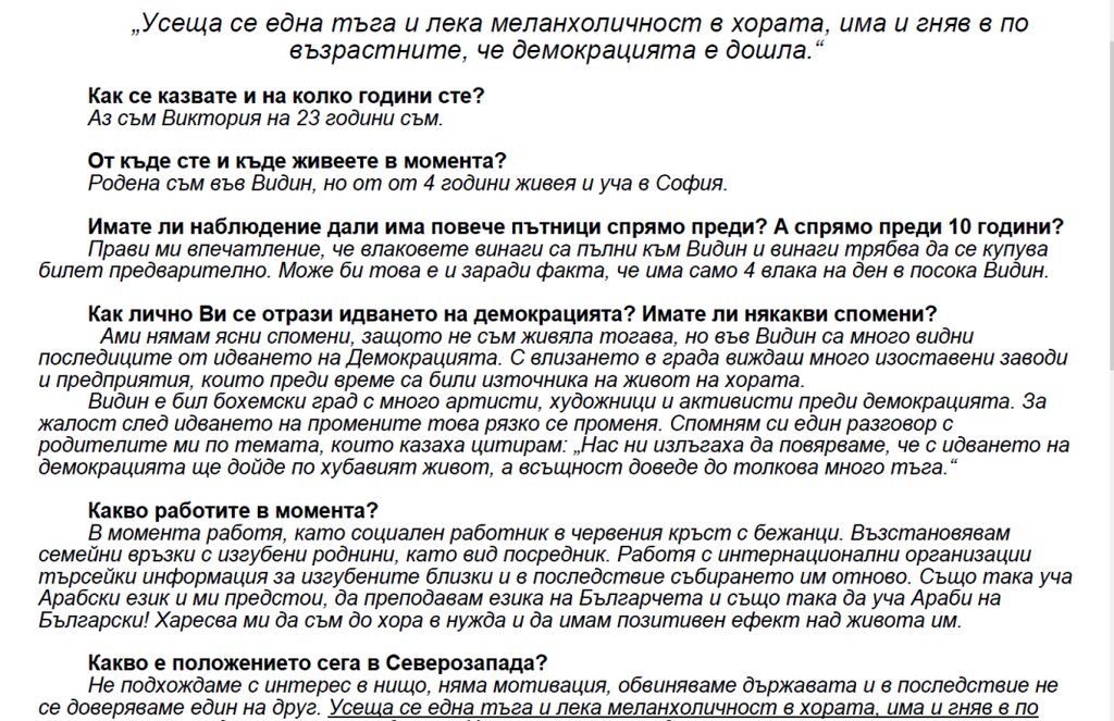 "Имало е много надежда, особено в поколението на моите родители. Едно обещаване, че ще бъде по-добро. Много от тях се чувстват разочаровани, излъгани. Докато по-младите – на моята възраст, интервюирани са и няколко души на 30, на 25 години, тяхното мнение е, че сега е много по-добро."