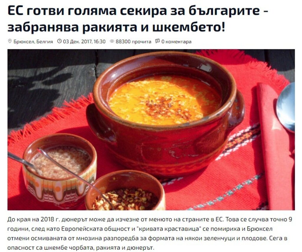 ЕС забранява ракията, а също и шкембе чорбата…Даже и дюнерите…Че и традиционните български розови домати. Въобще ще бъде сложен кръст на всичко "традиционно" и "изконно" за българския народ, традиции и обичаи. Всеки от нас е попадал на заглавия, претендиращи за сензационност, придружена от стремеж към защита на обществения интерес.
