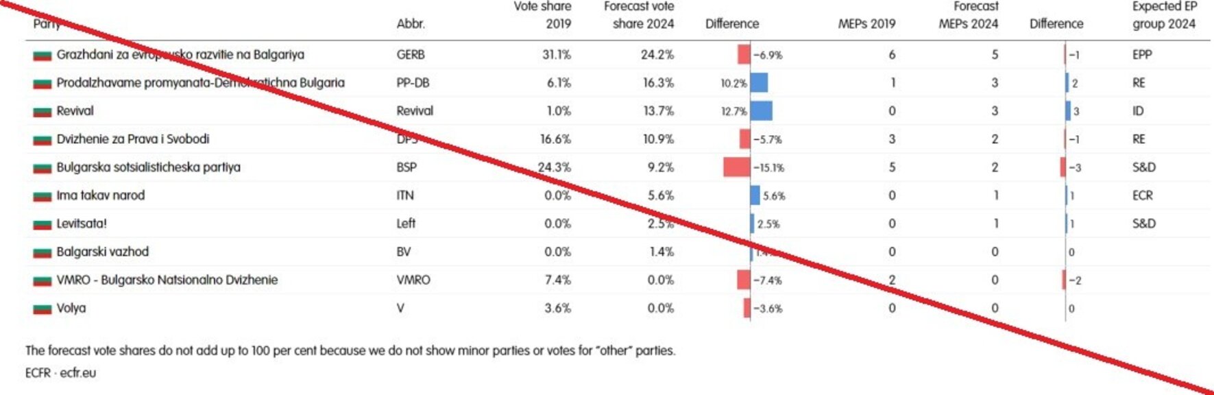Анализът за нагласите преди евровота на Европейския център за външни отношения даде прогноза за България (виж графиката по-долу), която обаче впоследствие бе