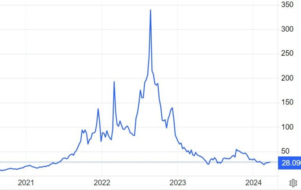 Европейските цени на газа спаднаха с около 15% от началото на 2024 г. поради меката зима и обилното предлагане, като те са с близо 90% по-ниски от рекордно високите стойности, наблюдавани през 2022 г.