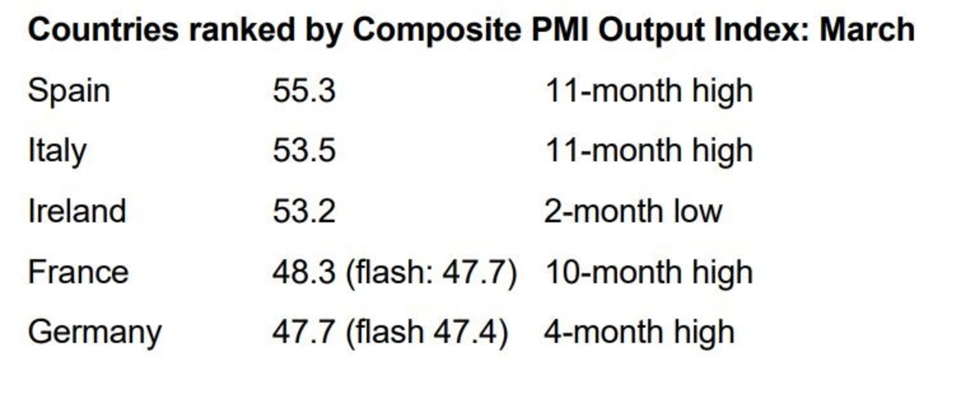 Сред най-големите икономики в блока солидна общата икономическа експанзии се наблюдава в Испания (11 месечен общ PMI индекс от 55,3 пункта), Италия (11-месечен връх от 53,5 пункта) и Ирландия (индекс от 53,2 пункта), а на другия полюс са Франция и Германия, където бизнес активността продължава да се свива с общи PMI индекси съответно на нива от 48,3 и от 47,7 пункта.