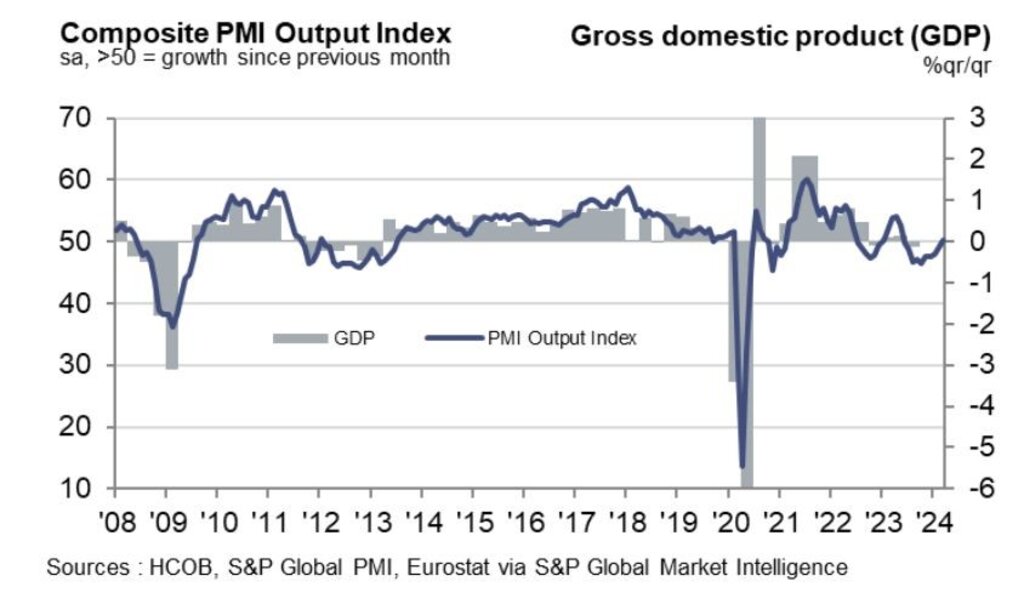 Икономическата активност в еврозоната нарасна през март до 10-месечен връх, завръщайки се към нивата на растеж за пръв път от май 2023 г., но възстановяването е неравно, като се дължи най-вече на по-силния от очакваното подем на бизнес активността в сферата на услугите, при все още низходящо движение в промишлената индустрия, показват окончателни данни от ежемесечното бизнес проучване на S&P Global и Търговската банка на Хамбург (Hamburg Commercial Bank).