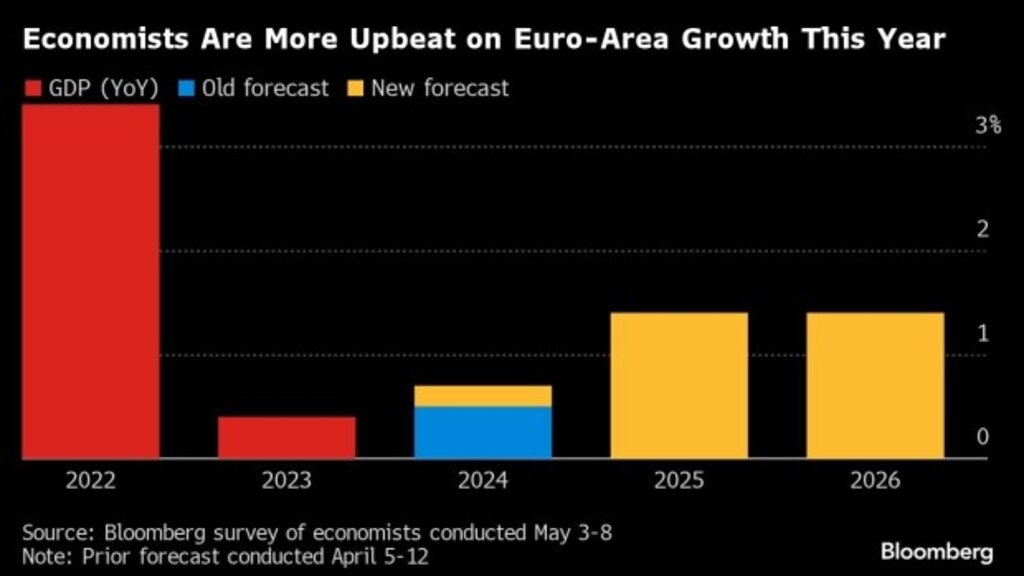 Икономиката на еврозоната ще нарасне тази година по-бързо, отколкото се смяташе досега, след като най-голямата европейска икономика в лицето на Германия започва да се измъква от продължилата повече от година стагнация, показа последно проучване на агенция Блумбърг сред водещи анализатори.