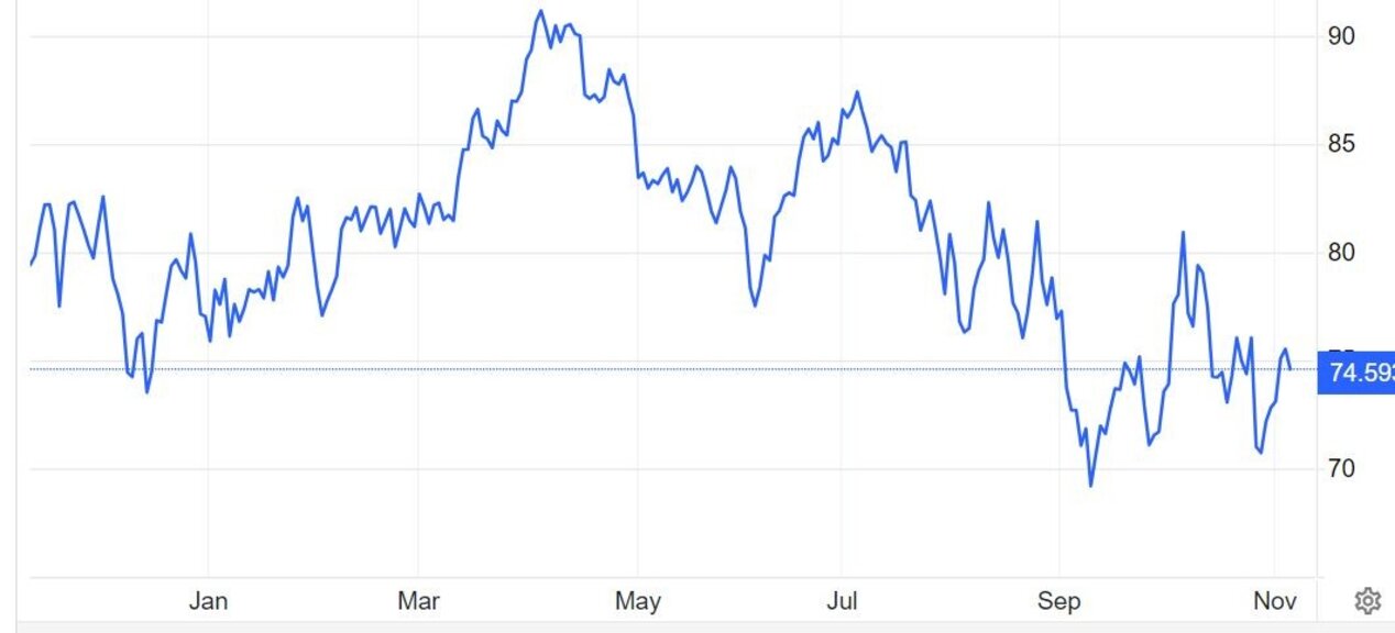 Към 09.30 часа българско време фючърсите на петрол Брент се понижават с 1,3% към 74,55 долара за барел, а тези на американския лек суров петрол WTI - с 1,28% към 71,05 долара за барел.