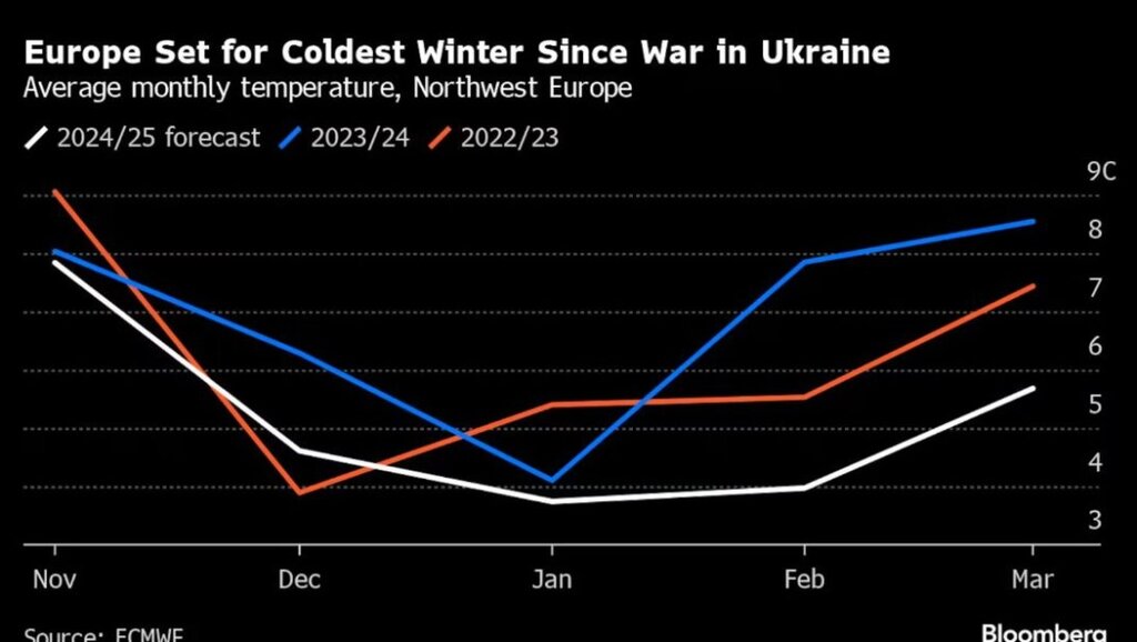 Средните температурите от сега до март 2025 г. се очаква да останат предимно под нивата, наблюдавани през последните две години, показват данни на Европейския център за средносрочни прогнози за времето (ECMWF). Това вероятно ще тласне търсенето на отопление до най-високото ниво от началото на руската инвазия в Украйна, според данни на Maxar Technologies Inc. Тази зима обаче, както и предходните две, се очаква температурите да се задържат над сезонните норми, допълват от ECMWF.