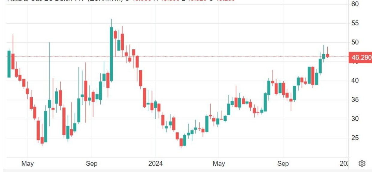 Днес търговията на нидерландския газов хъб TTF стартира на нива малко над 46 евро за мегаватчас, което е под едногодишния ценови връх около 49,368 евро/MWh от 22-ри ноември - най-високо ценово ниво от ноември 2023 г. През миналия ноември обаче газовите TTF фючърси започнаха трайно да поевтиняват, като през миналата зима дори паднаха към нива от 23-22 евро за мегаватчас с оглед на по-топлото за този сезон време.