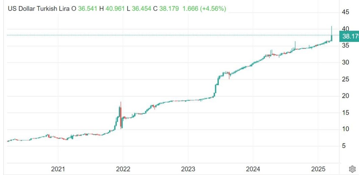 Непосредствено след новината за ареста на кмета на Истанбул турската валута се срина с цели 12% до нов исторически връх около 42 турски лира за един щатски долар, след което обаче се върна назад, опитвайки да стабилизира малко над нивото от 38 лири, поевтинявайки в рамките на деня с 4%.