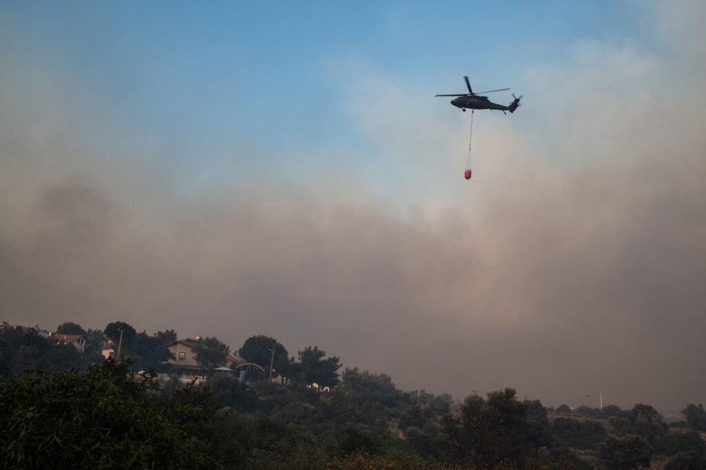 Хеликоптер участва в гасенето на пожарите в Шеферихисар, Измир, Турция, 30 юни 2025 г.; Снимка: ЕПА/БГНЕС