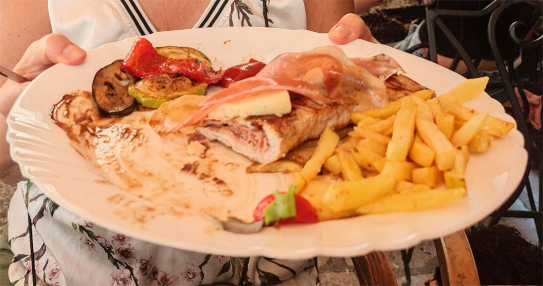 Аз съчетах двата местни специалитета в едно ястие като си поръчах негушка пържола – тънко филе от говеждо месо, увито като палачинка около местния сир и запечено с пршут и каймак отгоре.