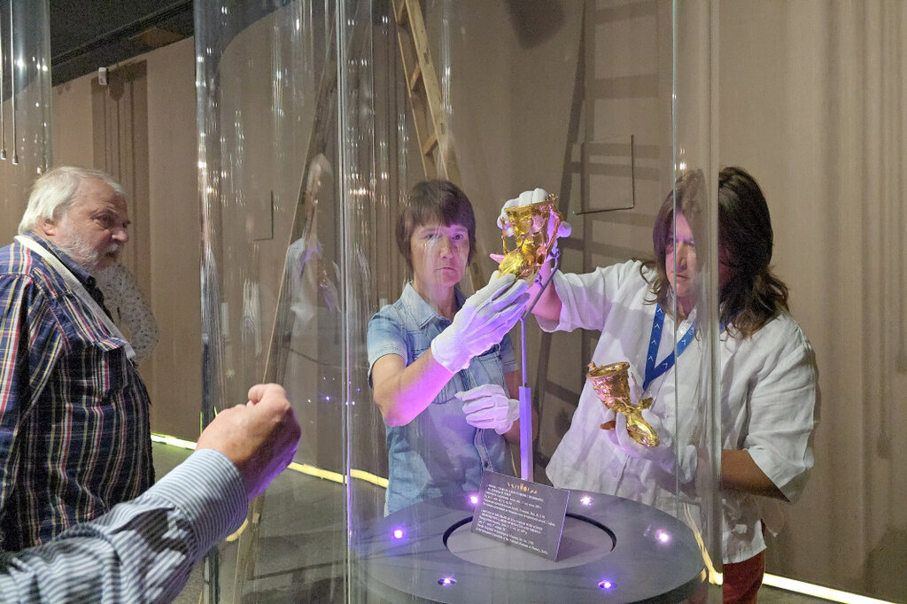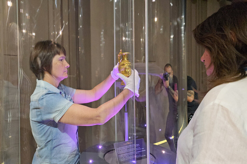 Репортер на БТА направи снимки в залата трезор, докато специалисти от Националния исторически музей и Историческия музей в Панагюрище подреждаха оригиналните съдове на мястото на 22-каратовото копие.