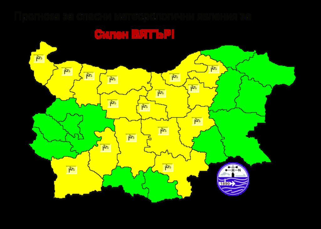 Жълт предупредителен код за силен вятър издаде за днес Националният институт по метеорология за 16 области (виж графиката по-долу).