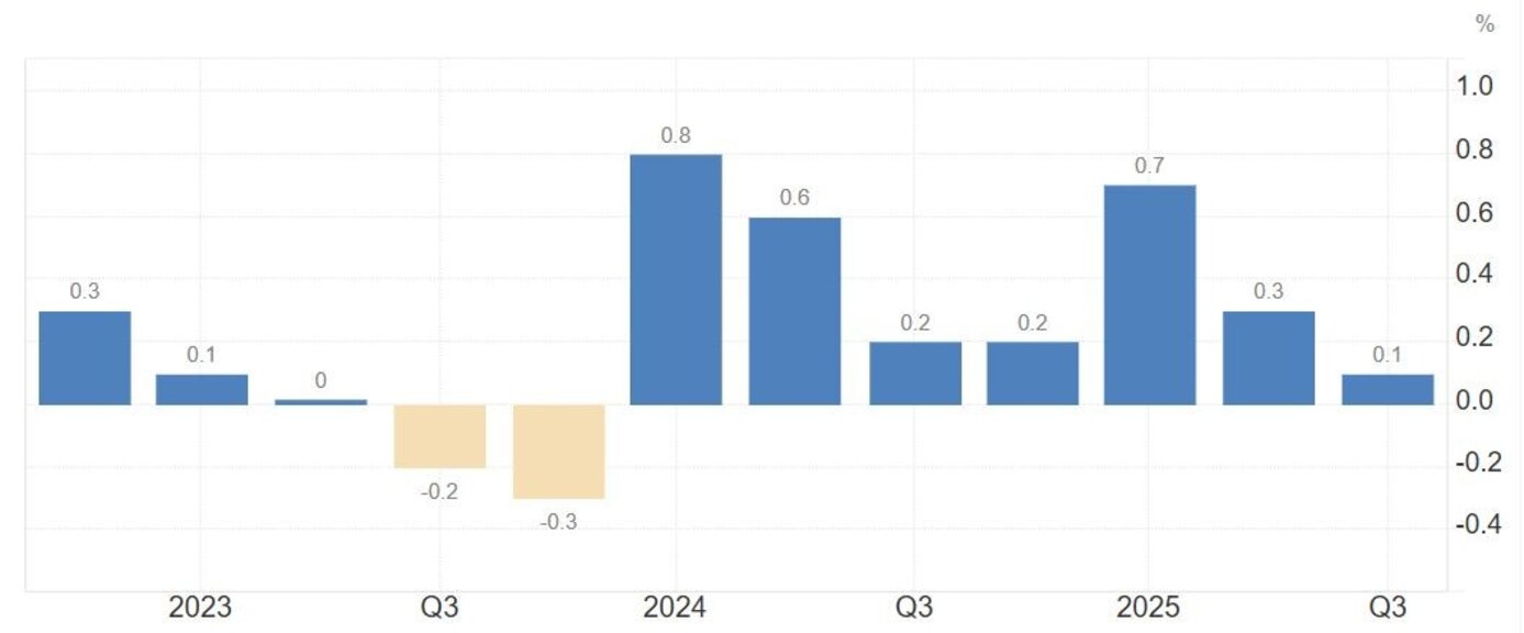 Това е най-слабото ѝ представяне от последното тримесечие на 2023 г., когато БВП се сви с 0,3% на тримесечна база.