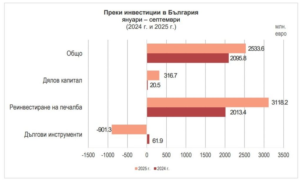 Преките чуждестранни инвестиции (ПЧИ) в страната нараства през септември с 473 млн. евро, при тяхно повишение с 370,2 млн. евро през септември година по-рано, като през първите девет месеца на тази година ПЧИ се увеличават с 2,5336 млрд. евро след тяхно повишение с 2,0958 млрд. евро през същия период на 2024 г.