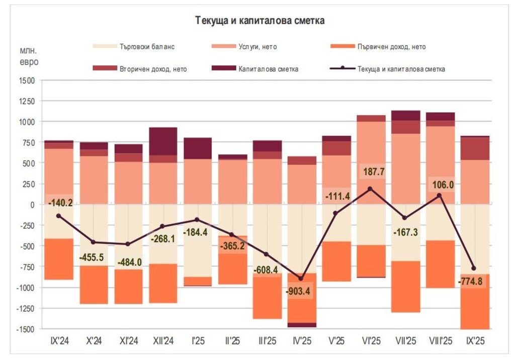 Балансът по текущата и капиталова сметка на България през септември е отрицателен и в размер на 774,8 млн. евро при дефицит за от 140,2 млн. евро точно преди година, като през първите девет месеца на настоящата година има дефицит в размер на 2,8212 млрд. евро при положително салдо от 1,3609 млрд. евро през периода януари - септември 2024 г.