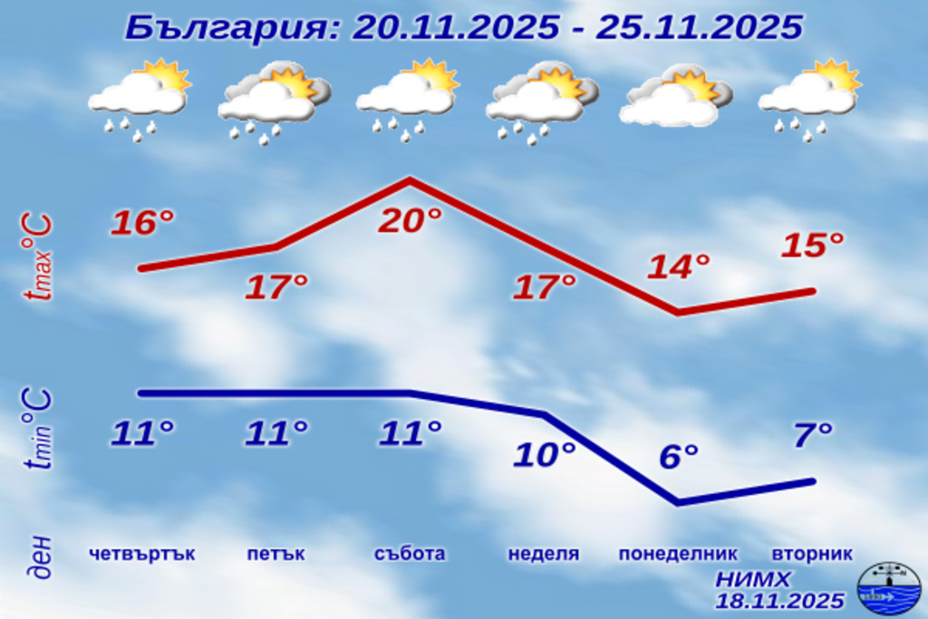 През следващите дни до края на седмицата времето ще остане доста динамично. Температурите в страната ще са в широки граници, минималните ще са от 6°-7° в северозападните райони до 15°-16° в югоизточните, а максималните от 10°-12° на места в Западна България до 20°-21° в Източна.