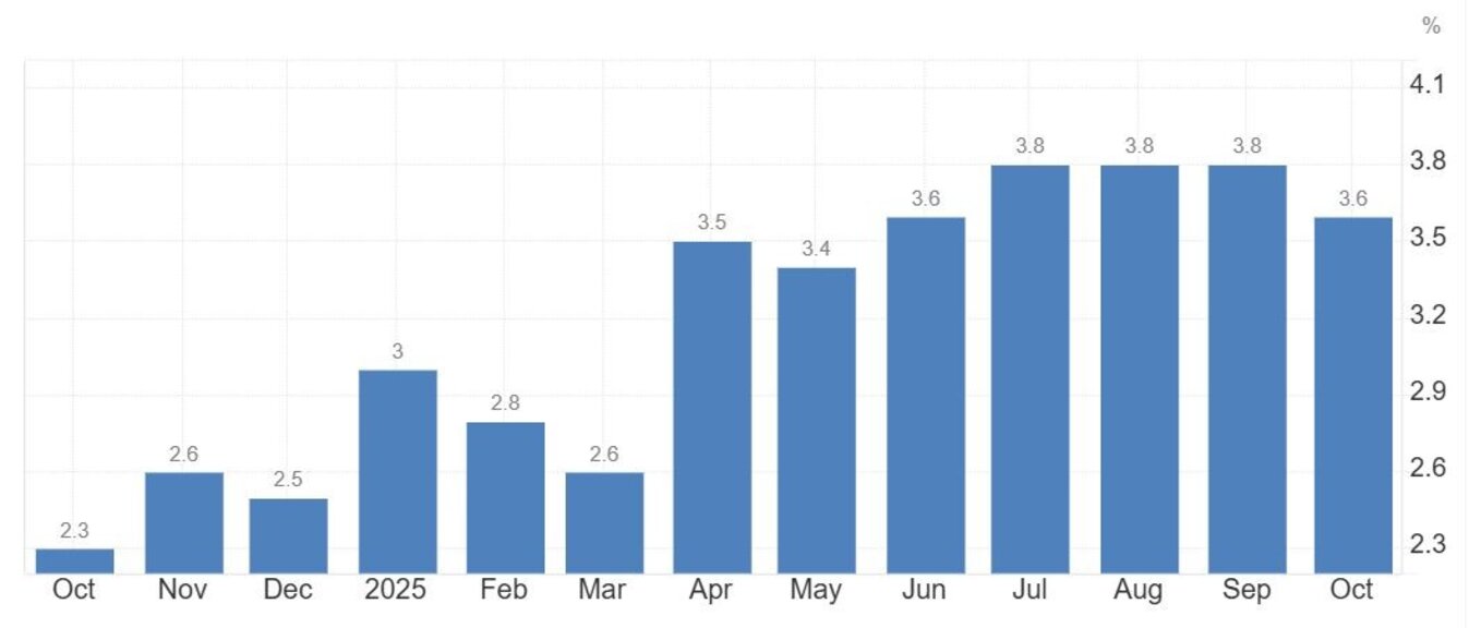 Годишната инфлация във Великобритания се забави очаквано през октомври до 3,6% след три поредни месеца на растеж с 3,8%, показват данни на официалната статистика на страната ONS. Това е първото отслабване на инфлацията от май насам и в рамките на пазарните и на прогнозите на Английската централна банка.