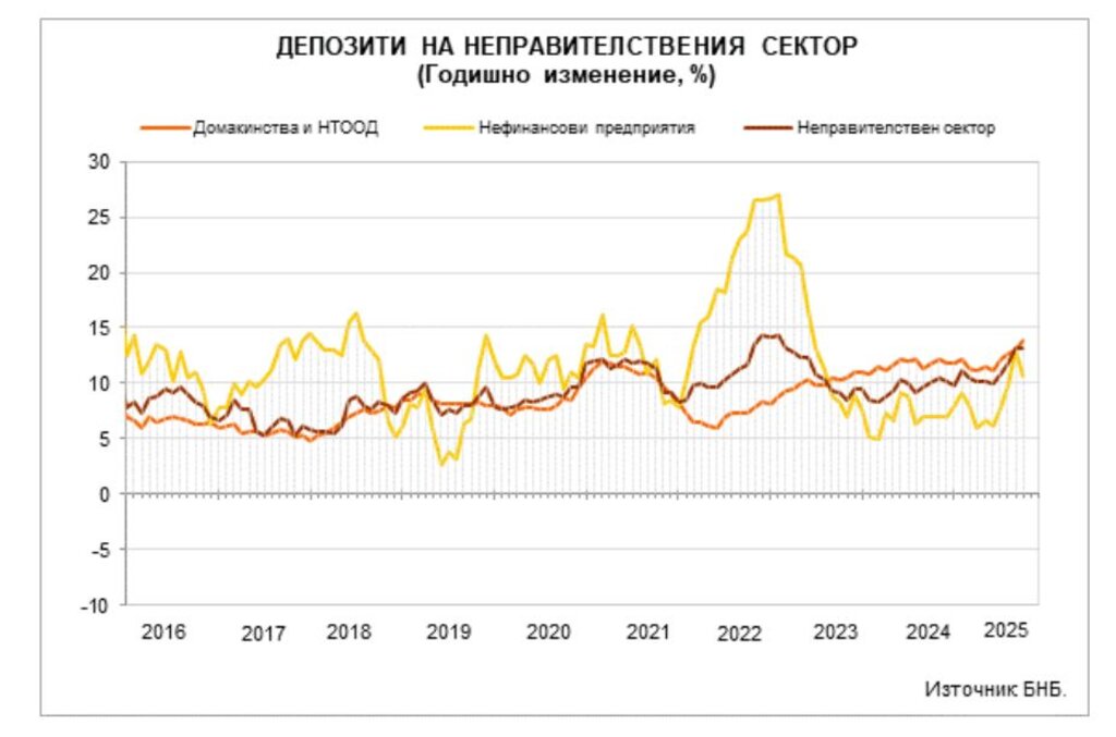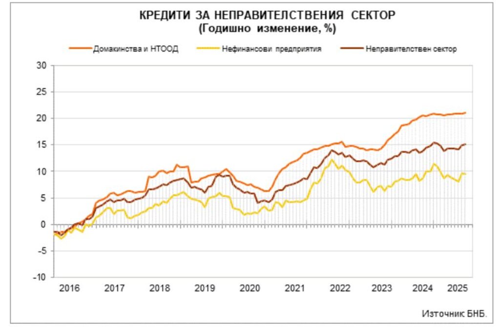 В същото време кредитите за неправителствения сектор през десетия месец на 2025 г. са в размер на 115,716 млрд. лева (52,7% от БВП), като нарастват на годишна база с 15,1% след повишение с 15% през септември.