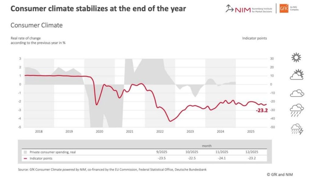 Потребителските нагласи в Германия за декември се повишиха слабо от 7-месечното дъно, достигнато през ноември, благодарение на засилване на склонността за покупки и намаляване на нивото на спестовност, но при влошаване на икономическите и на очакванията за доходите.