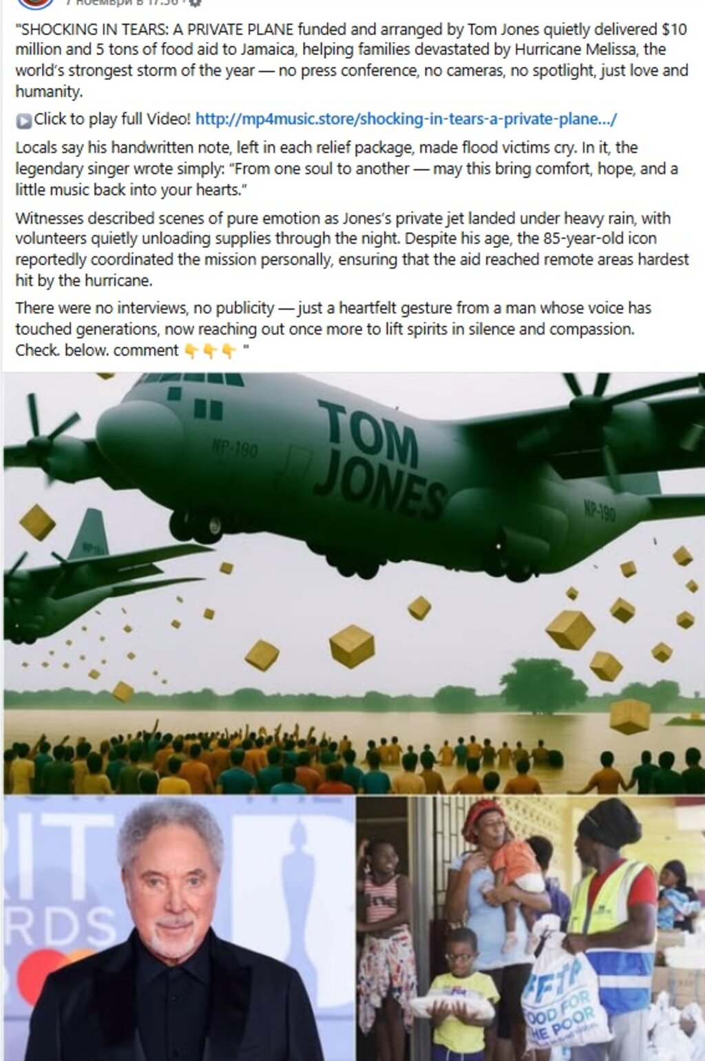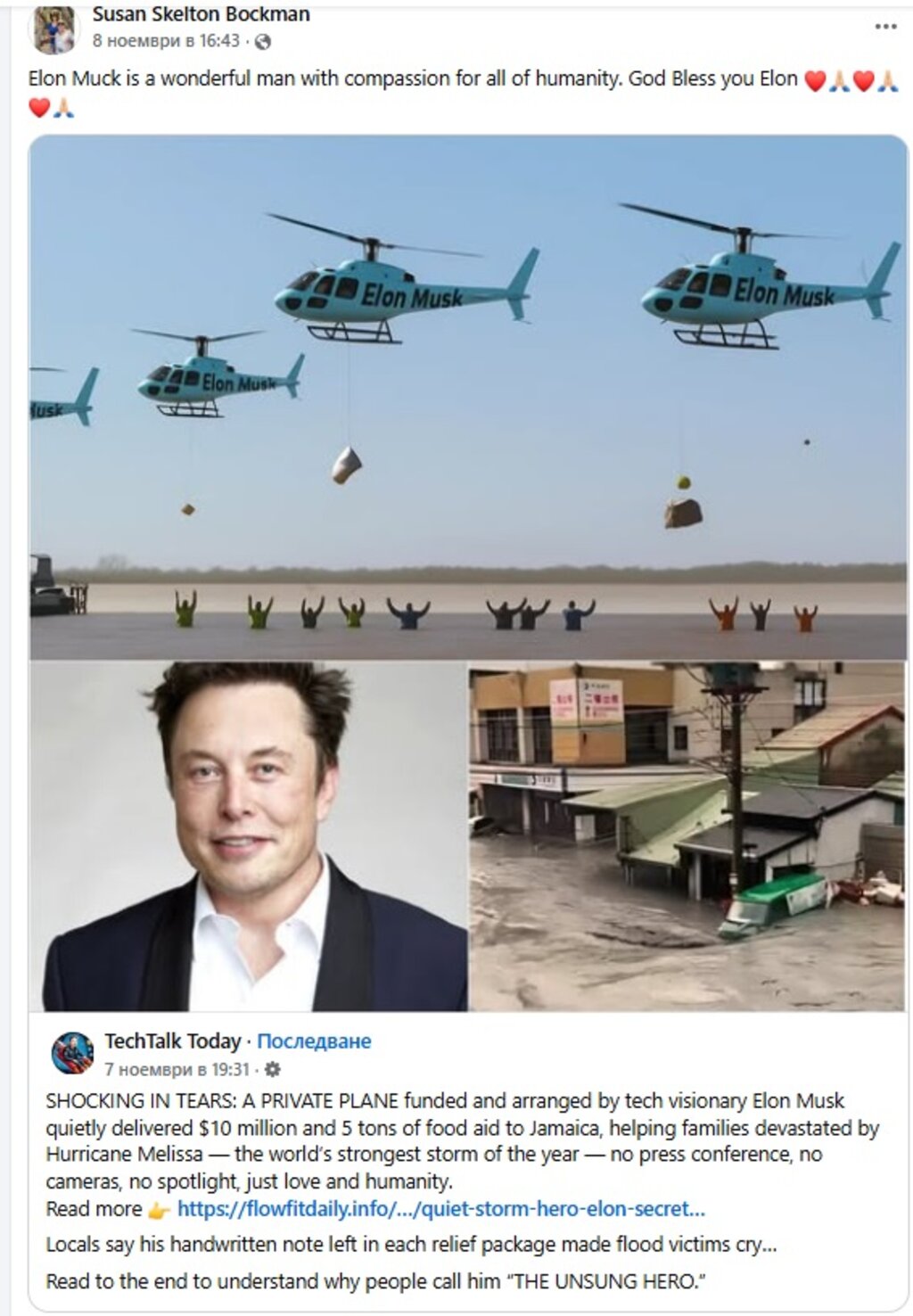 С един и същи текст и подобни снимки (на някои места хеликоптерите са заменени със самолети), сменени са и лицата на личностите, но твърдението е еднакво – направено дарение от 10 милиона долара и 5 тона хранителни помощи на Ямайка. Всички публикации са направени в един и същи времеви диапазон – от началото до средата на ноември.