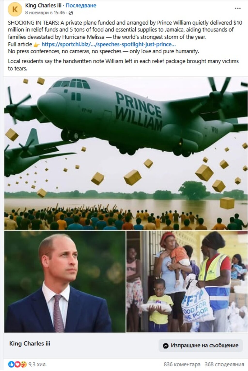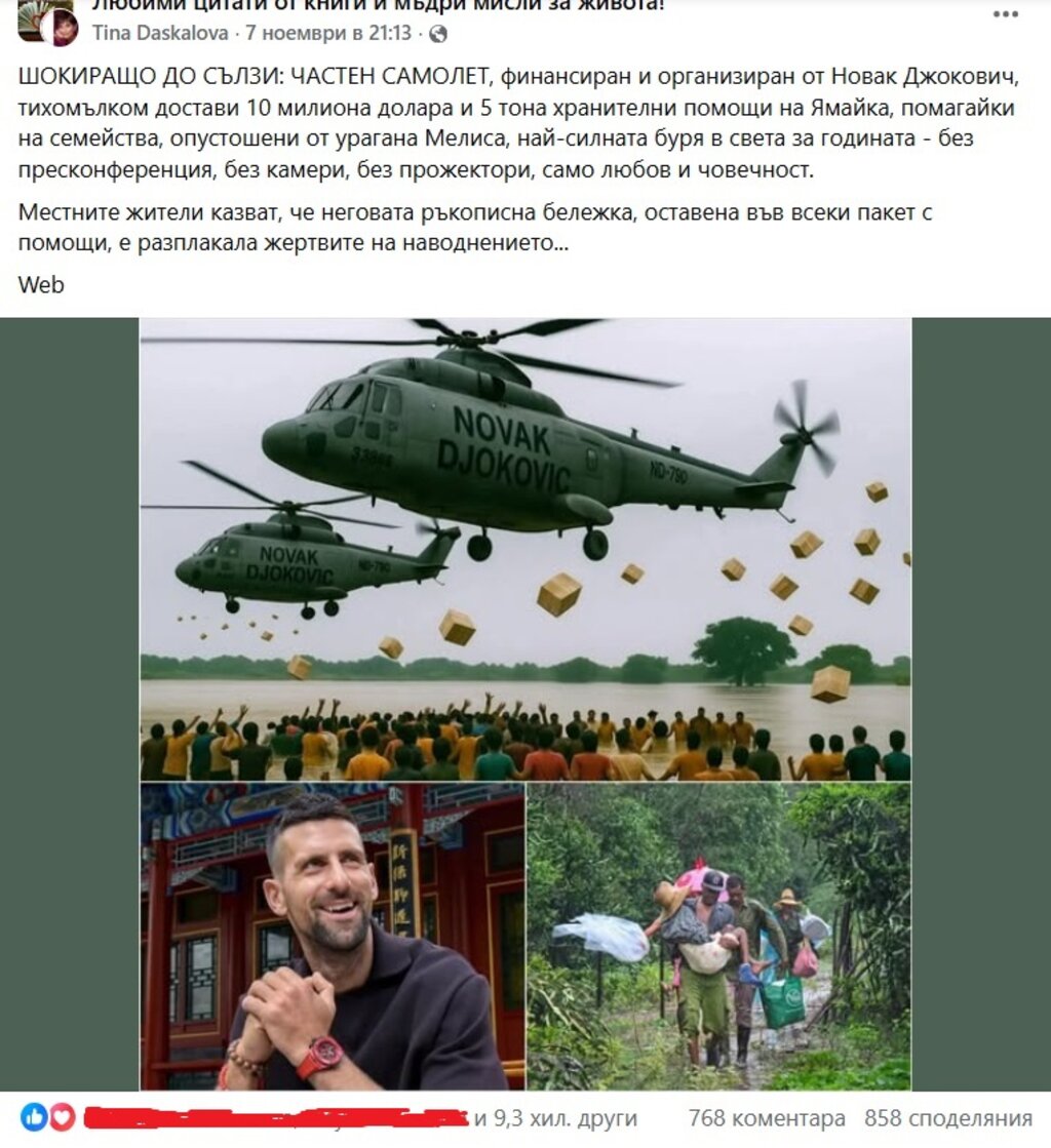 В информацията се казва, че частен самолет, финансиран и организиран от тенисиста, е направил дарението след най-силната буря в света за годината, без камери, без прожектори, без пресконференция, само от любов и човечност. Твърдението е споделено стотици пъти и има над 9300 реакции.