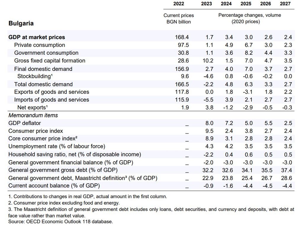 Организацията за икономическо сътрудничество и развитие посочи, че икономическият растеж на България ще остане силен през тази година, като БВП се очаква да нарасне с 3%, преди обаче експанзията да се забави до 2,6% през 2026 г. и след това до 2,4% през 2027 г.