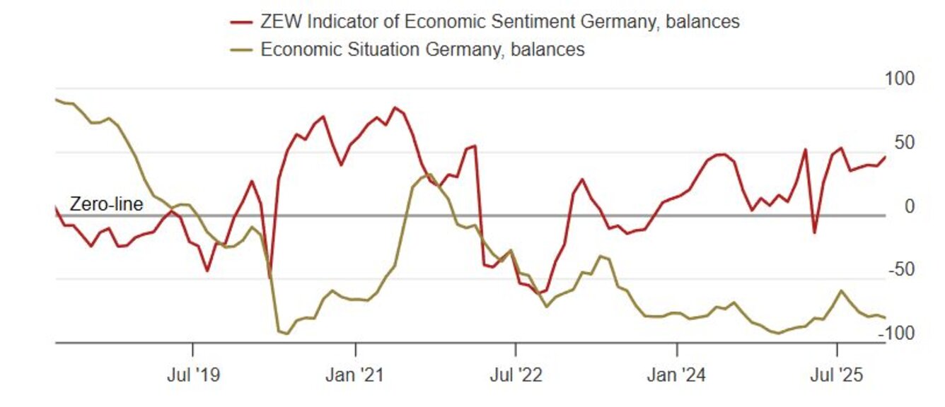"Очакванията се подобриха. След три години икономическа стагнация, настоящите настроения отразяват добри перспективи за икономическо възстановяване. Експанзионистичната фискална политика ще даде нов импулс на германската икономика. Възстановяването обаче остава крехко. Справянето с продължаващите търговски конфликти, геополитическото напрежение и липсата на инвестиции вероятно ще остане в дневния ред на реформите през 2026 г.", коментира резултати от най-новото проучване президентът на ZEW, професор Ахим Вамбах.Забележително е подобрението в автомобилния сектор, като балансът на съответния ZEW индекс се увеличи през декември с цели 7,7 пункта до ниво от -22,0 пункта. Други експортно ориентирани сектори, като химическата и фармацевтичната промишленост, както и производството на метали, също регистрират ръст, макар и по-малък. Въпреки фискалната подкрепа, тези сектори продължават да бъдат възпрепятствани от слабия импулс на износа поради високите тарифи и структурните конкурентни недостатъци, отбелязва ZEW.