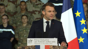 Макрон говори пред войски, базирани във френска военна база в Абу Даби, разположена близо до Ормузкия проток, ключова точка за световните петролни потоци.