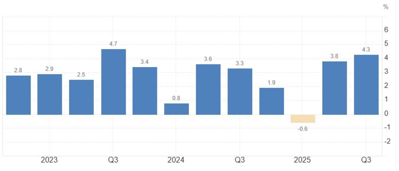 Икономиката на САЩ нарасна на годишна база с 4,3% през третото тримесечие на 2025 г., надвишавайки значително очакванията за повишение с 3,3%, показват данните на Бюрото за икономически анализи, които бяха забавени във времето заради 43-дневното спиране на работата на федералното правителство.