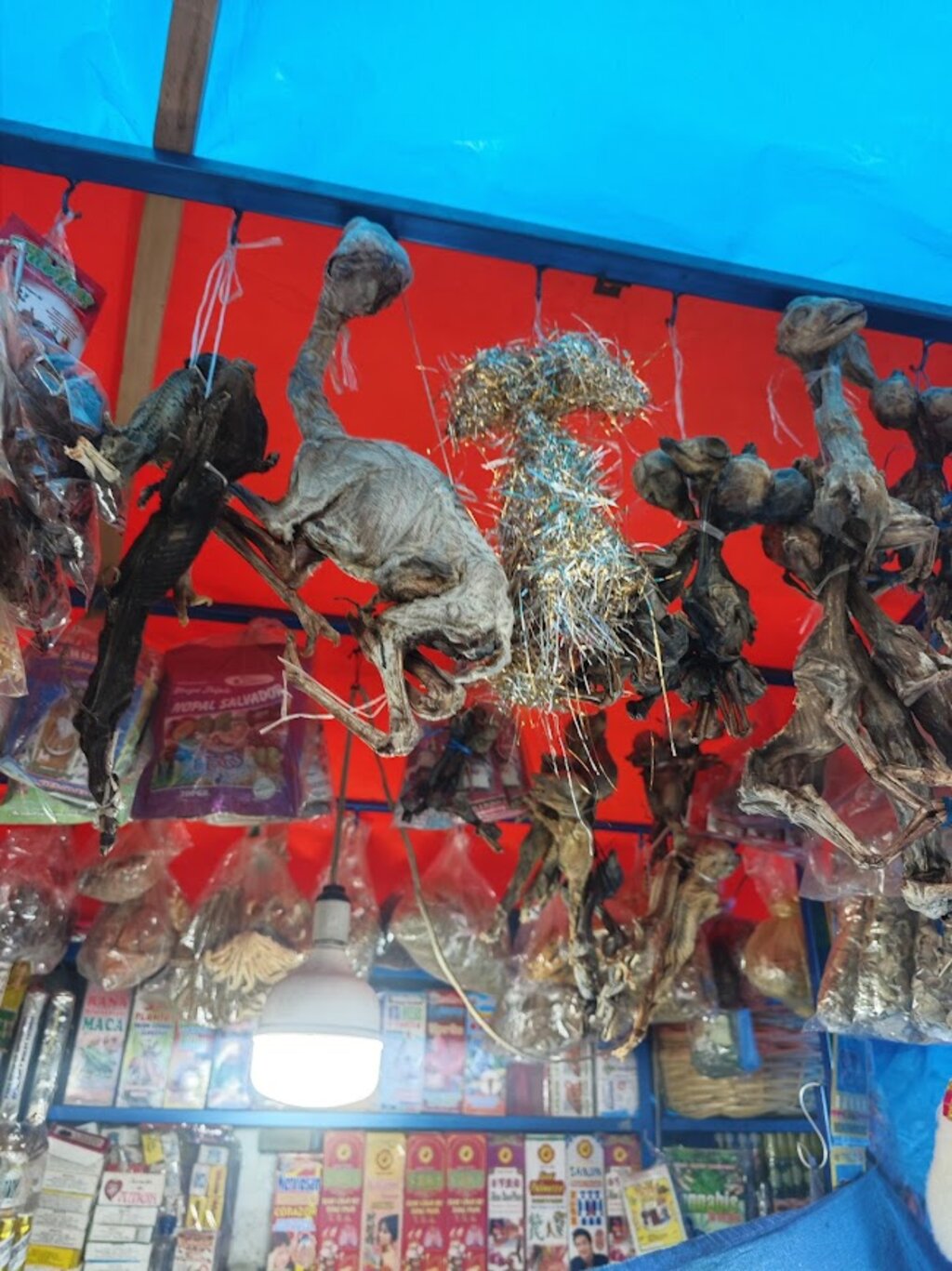 Местните индианци се кълнат, че зловещите амулети се получават по естествен път: ламите понякога имат спонтанни аборти и мъртвородени бебета, но под сурдинка се говори, че някои животни все още се убиват по време на бременност. Между другото, животинските жертвоприношения все още се практикуват в Боливия и днес, а най-популярните жертви са или лама, или алпака. Тези симпатични животни се използват за умилостивяване на Ел Тио, злия дух на подземния свят. Например, преди да слязат в забоите, миньорите му оставят дарове и намазват кръвта затиналата "андинска овца" по входа и дори по стените на галериите в мината. Така си осигуряват помощта на Ел Тио е за извличането на повече полезни изкопаеми и ще предпази миньорите от злополуки. Така че, лами от всякакви размери могат да бъдат намерени на пазара на вещиците. Инките са ги използвали и за транспорт на товари по непристъпните пътеки на Андите, прекланяйки се пред факта, че макар да не разполагат с измервателни уреди ламите спират след точно 21 км вървеж и няма земна сила, която да ги накара да тръгнат, преди да са си починали.