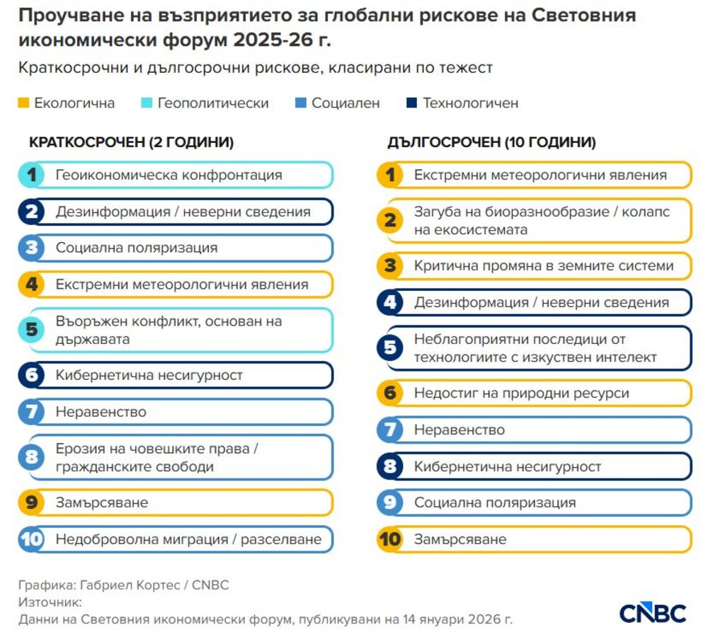 Според доклада "Глобални рискове" на Световния икономически форум (WEF), публикуван в сряда, световните съперничества за власт и стратегическите противопоставяния оглавяват списъка с най-сериозните краткосрочни рискове за 2026 г., съобщава CNBC. Несигурността е "определяща тема" на перспективите за глобалните рискове за тази година.