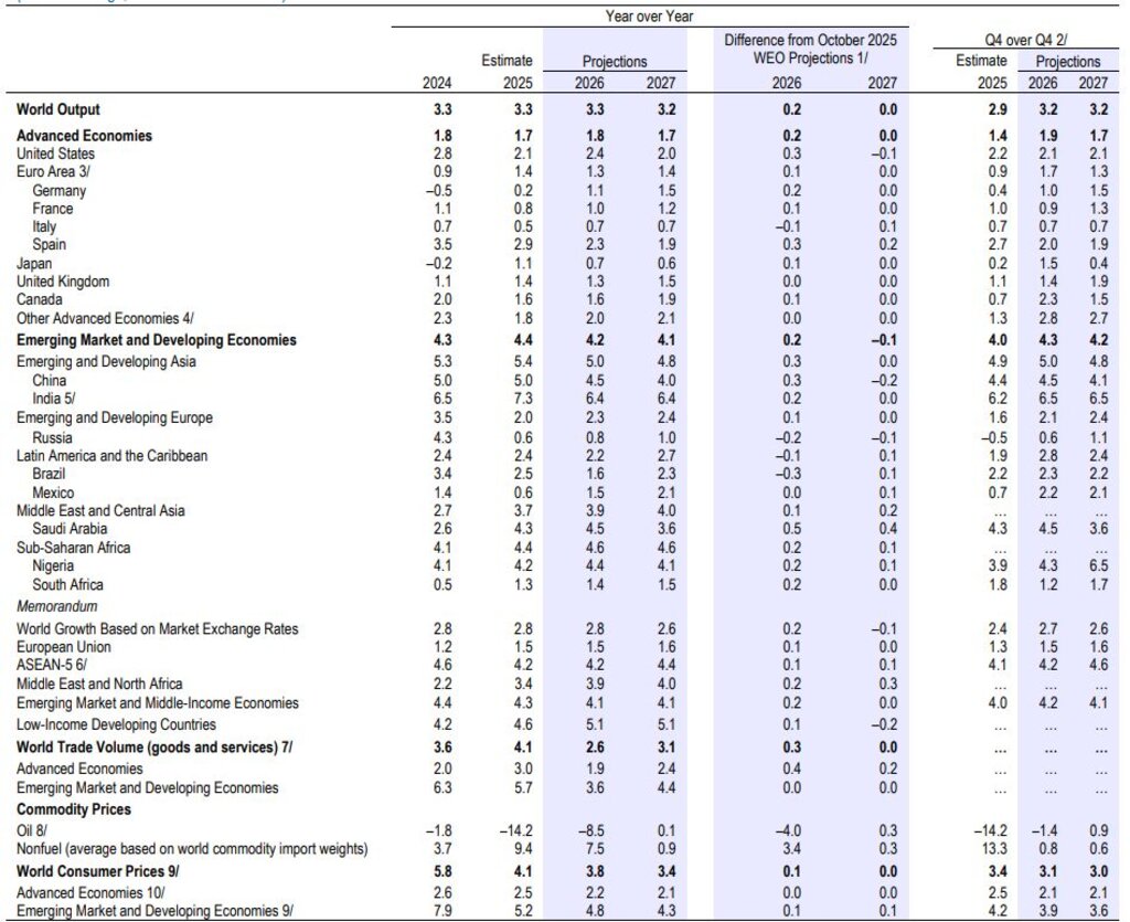 В актуализирания си доклад "Световни икономически перспективи" МВФ прогнозира растеж на глобалния БВП от 3,3% през 2026 г., което е с 0,2 процентни пункта повече от последната оценка на Фонда през миналия октомври. МВФ ревизира нагоре и оценката си за световния икономически растеж през 2025 г. до 3,5% от 3,4% през октомври.