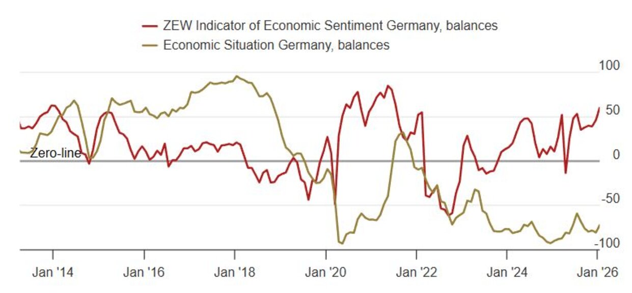 Индексът на базирания в Мюнхен изследователски институт ZEW, измерващ бъдещите икономически очаквания в Германия за следващите шест месеца, скочи рязко през януари до 59,6 пункта от 45,8 пункта през декември 2025 г., достигайки най-високо ниво от юли 2021 г. насам, докато очакванията бяха за доста по-слабо подобрение към 50 пункта.