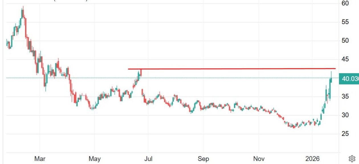 Февруарските TTF фючърси продължават да се търгуват и днес около и над 40 евро/MWh, като в началото на търговия в четвъртък дори достигнаха за кратко ценови връх към 41,86 евро, доближавайки предишния по-значим пик около 42,26 евро от 23-ти юни 2025 г.
