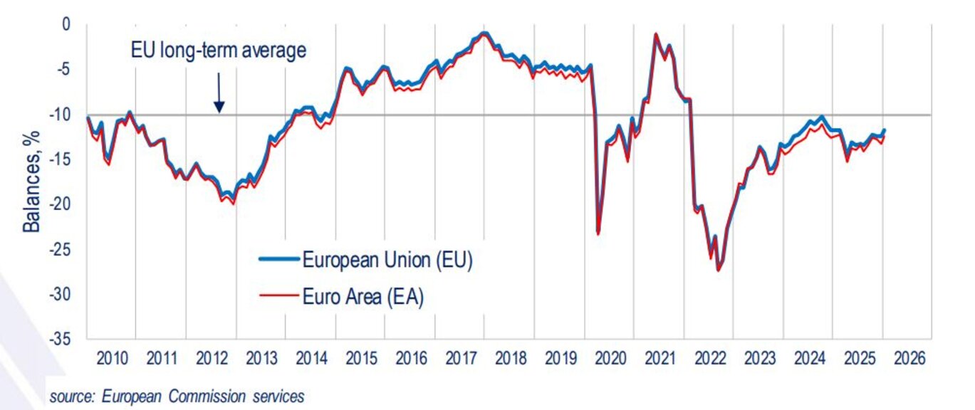 Индексът на потребителското доверие в еврозоната се повиши с 0,8 пункта до -12,4 пункта от -13,2 пункта през декември 2025 г. (низходяща ревизия от -13,1 пункта предишна оценка). Това е най-високото му ниво от февруари 2025 г.