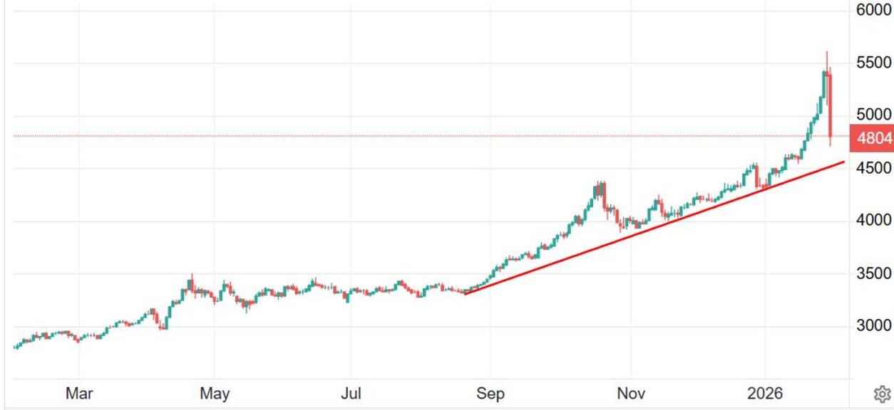Към 20.15 часа българско време цената на златото на спот пазара се понижи с цели над 12% към 4716 долара за тройунция, след като само ден по-рано беше достигнат нов рекорден връх от 5608 долара. Това представлява рекорден дневен спад на жълтия метал.