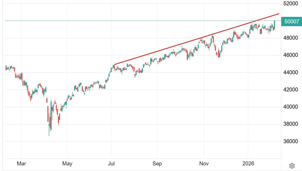 Междувременно индексът на т.нар. "сини чипове" DJIA проби за пръв път в историята над психологическата бариера от 50 000 пункта, нараствайки в рамките на днешната търговия с над 1100 пункта (или с 2,26%).
