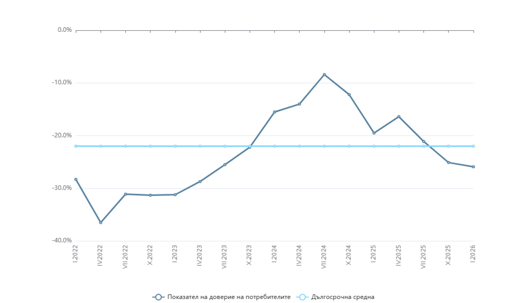 През януари 2026 г. общият показател на потребителското доверие в България се понижава с 0,8 пункта до -25,9% в сравнение с -25,1 % през октомври 2025 г. Това представлява влошаване на нагласите на потребителите за трето поредно тримесечие и тяхно най-ниско ниво от второто тримесечие на 2022 г.
