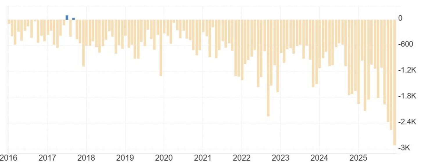 За цялата 2025 г. износът на стоки от България се свива с 3,2% до 83,8945 млрд. лева спрямо 2024 г., докато вносът на стоки в нашата страна нараства с 6,1% до 105,6051 млрд. лв., а общото външнотърговско салдо за периода януари - декември 2025 г. е на дефицит от 21,7106 млрд. лева.